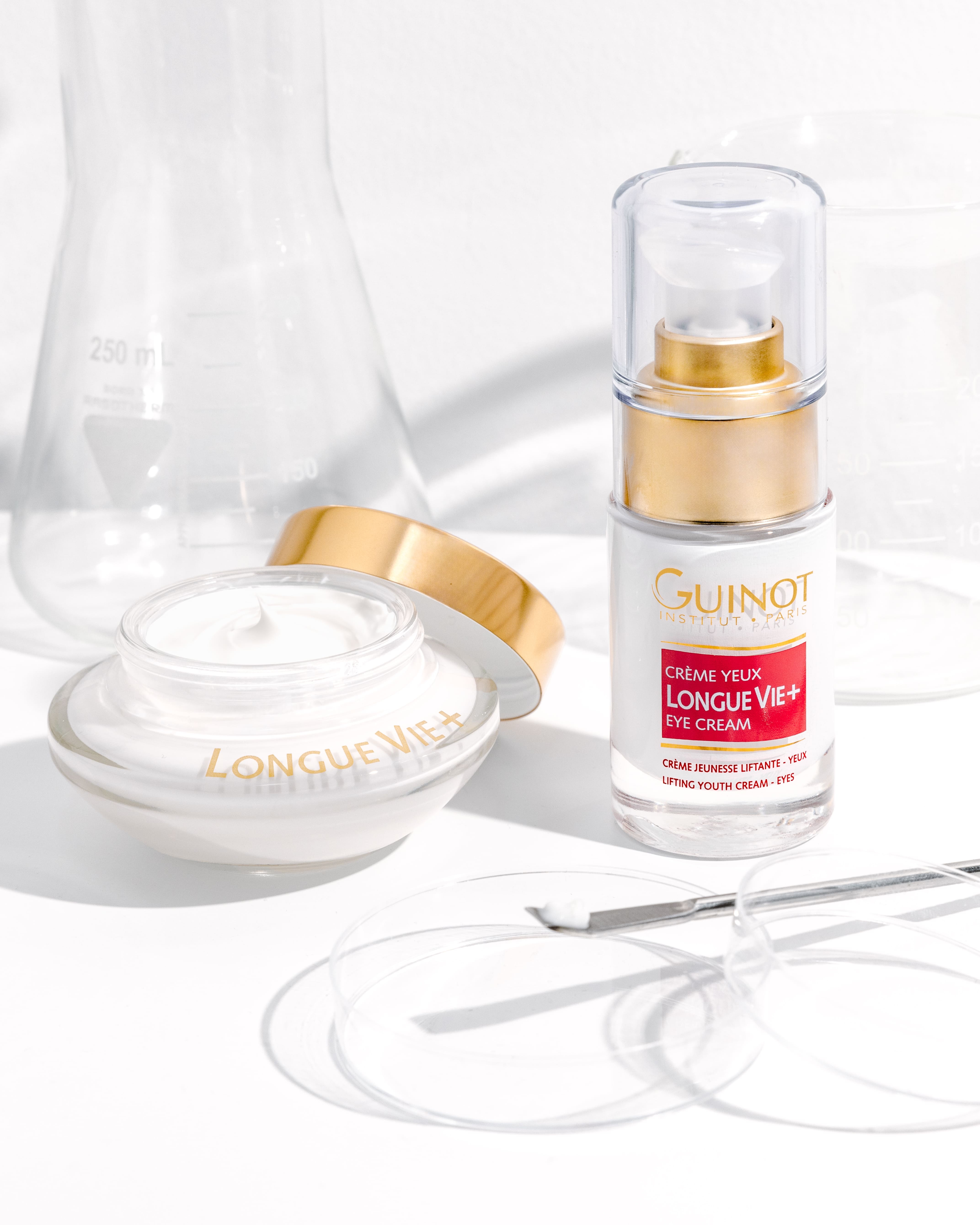 Guinot créé des formules de soins de haute technologie fabriquées par son laboratoire aux normes pharmaceutiques.